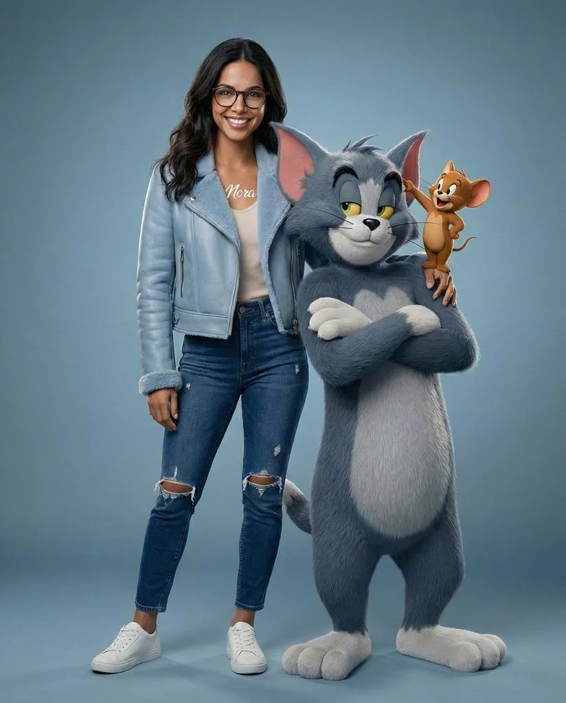 Highly realistic cinematic studio portrait of a woman using the attached reference image as the primary visual source, perfect 1:1 identity match, full identity lock enabled, no changes to facial structure, proportions, skin texture, or facial features. Face identical to the original reference image, ultra-realistic skin detail. Preserve the glasses exactly as shown in the reference image. She is wearing a light blue sheepskin leather jacket, high-waisted dark blue ripped jeans, and white women’s ankle sneakers. Her right arm is wrapped naturally around a lifelike, human-scale 3D Tom character standing upright with arms crossed. Jerry is perched on Tom’s shoulder, his tiny paw playfully touching Tom’s ear. Expressions are clearly defined: the woman has a mischievous grin, Tom displays a confident sideways glance, and Jerry shows a playful smile. Blue-gray professional studio backdrop with cinematic backlighting, ultra-high-definition textures, sharp focus, realistic material rendering, clean studio aesthetic, editorial-quality realism. Negative prompt: identity change, face distortion, altered facial features, different hair or glasses, cartoon style, illustration, anime, low-poly 3D, plastic skin, beauty filters, blur, low resolution, low quality, noise, artifacts, exaggerated proportions, extra limbs, watermark, logo, text.